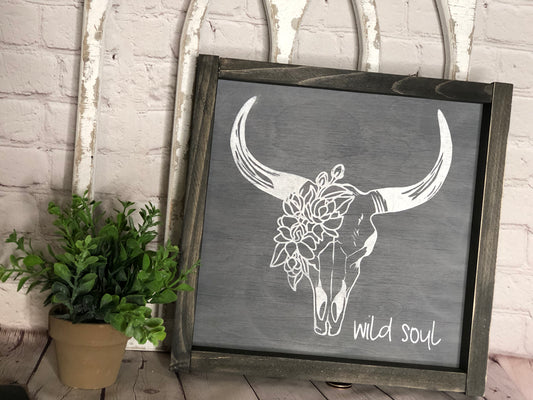 COW SKULL WITH FLOWERS WILD SOUL -FRAMED WOOD SIGN