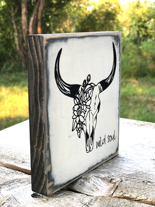COW SKULL WITH FLOWERS WILD SOUL -WOOD SIGN