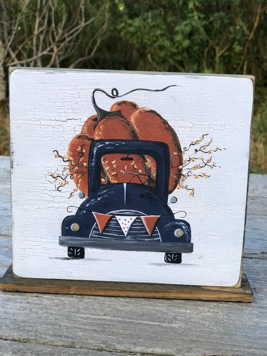 TRUCK -5.5 IN NAVY TRUCK WITH PUMPKIN PRINT ON STAND - WOOD SIGN
