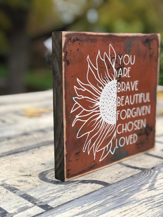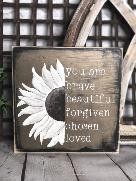 HAND-PAINTED SUNFLOWER YOU ARE BRAVE, BEAUTIFUL, FORGIVEN, CHOSEN, LOVED WOOD SIGN