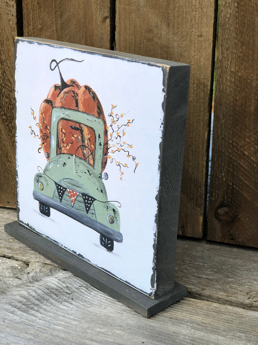 TRUCK -5.75 IN. SAGE TRUCK WITH PUMPKIN PRINT ON STAND - WOOD SIGN