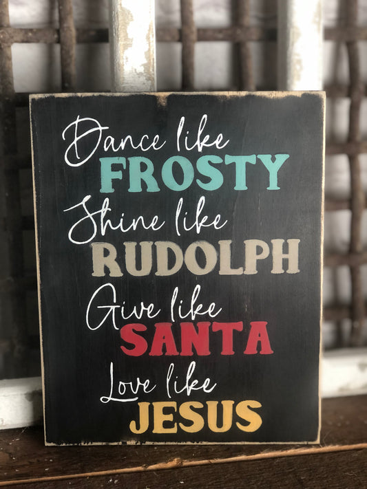 DOUBLE SIDED DANCE LIKE FROSTY, SHINE LIKE RUDOLPH, GIVE LIKE SANTA, LOVE LIKE JESUS/OH HOW HE LOVES US OR I CAN DO ALL THINGS THROUGH CHRIST -WOOD SIGN