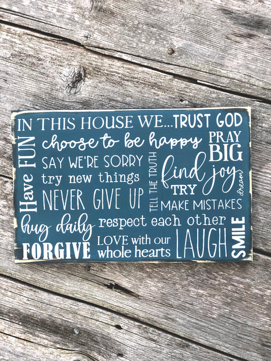 IN THIS HOUSE TRUST GOD, CHOOSE TO BE HAPPY, PRAY BIG, HAVE FUN, TELL THE TRUTH, SMILE - WOOD SIGN