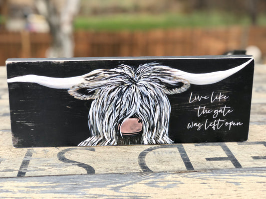 LIVE LIKE THE GATE WAS LEFT OPEN HIGHLANDER COW PRINT - WOOD SIGN