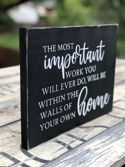 THE MOST IMPORTANT WORK YOU WILL EVER DO WILL BE WITHIN THE WALLS OF YOUR OWN HOME - WOOD SIGN