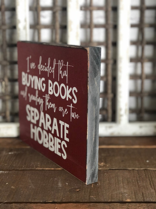 I'VE DECIDED THAT BUYING BOOKS AND READING THEM ARE TWO SEPARATE HOBBIES - WOOD SIGN