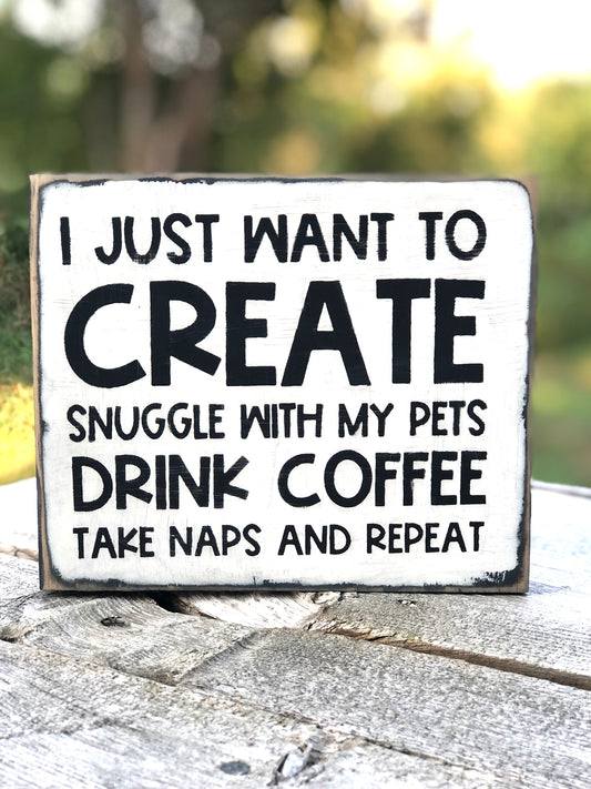 I JUST WANT TO CREATE, SNUGGLE WITH MY PETS, DRINK COFFEE, TAKES NAPS AND REPEAT- WOOD SIGN
