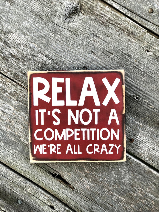 RELAX IT’S NOT A COMPETITION -WE’RE ALL CRAZY -WOOD SIGN