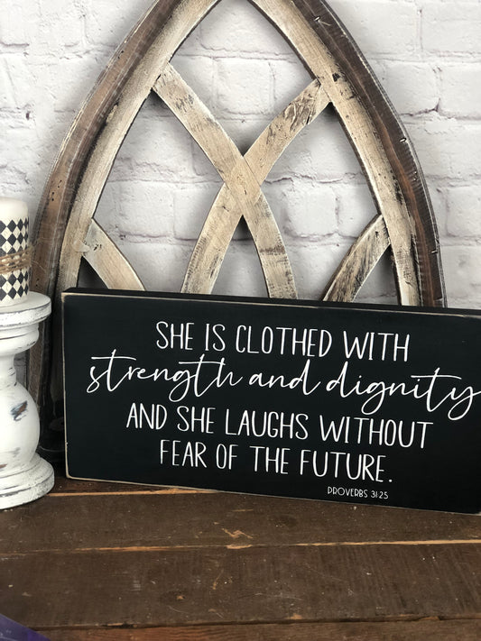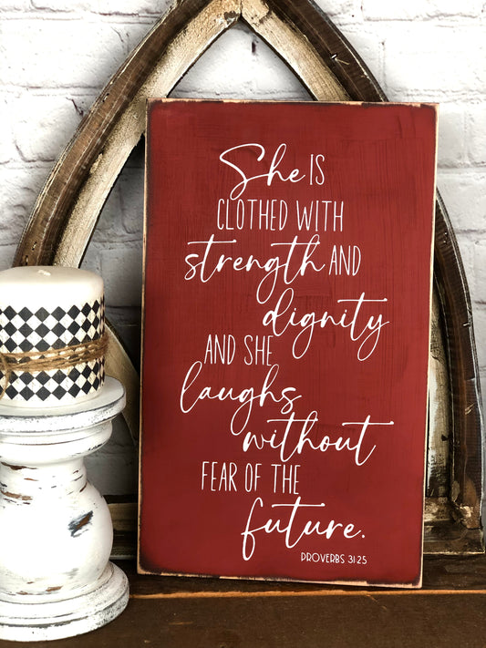SHE IS CLOTHED WITH STRENGTH AND DIGNITY AND SHE LAUGHS WITHOUT FEAR OF THE FUTURE - WOOD SIGN