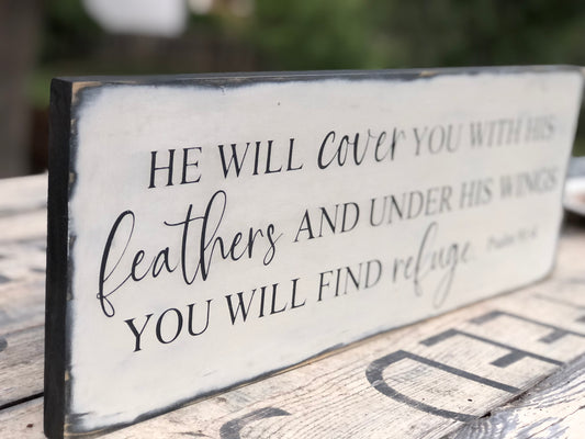 HE WILL COVER YOU WITH HIS FEATHERS - WOOD SIGN