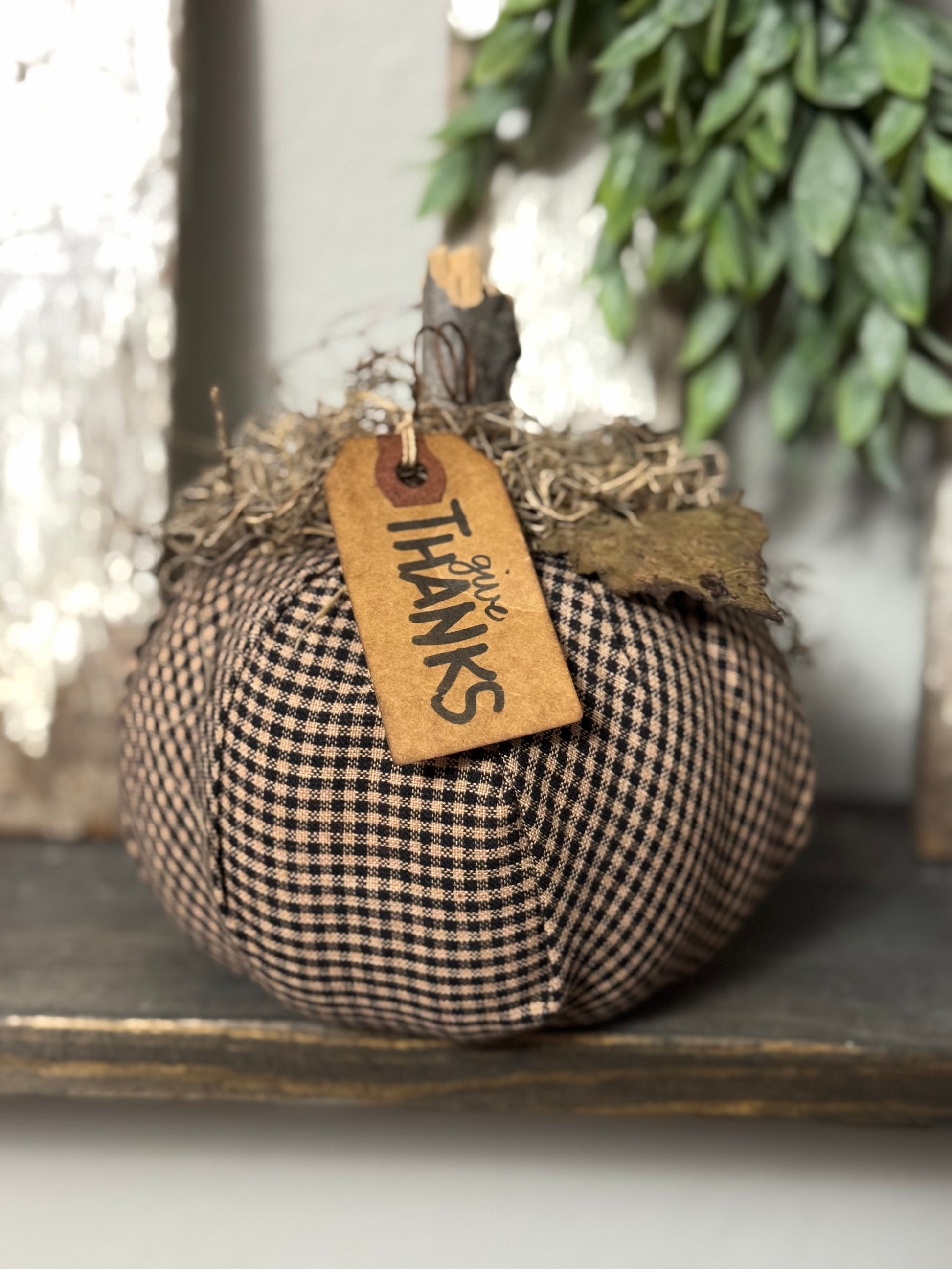 - pumpkin with the fall fabric, a twig stem and a tag with give thanks, blessed or grateful
