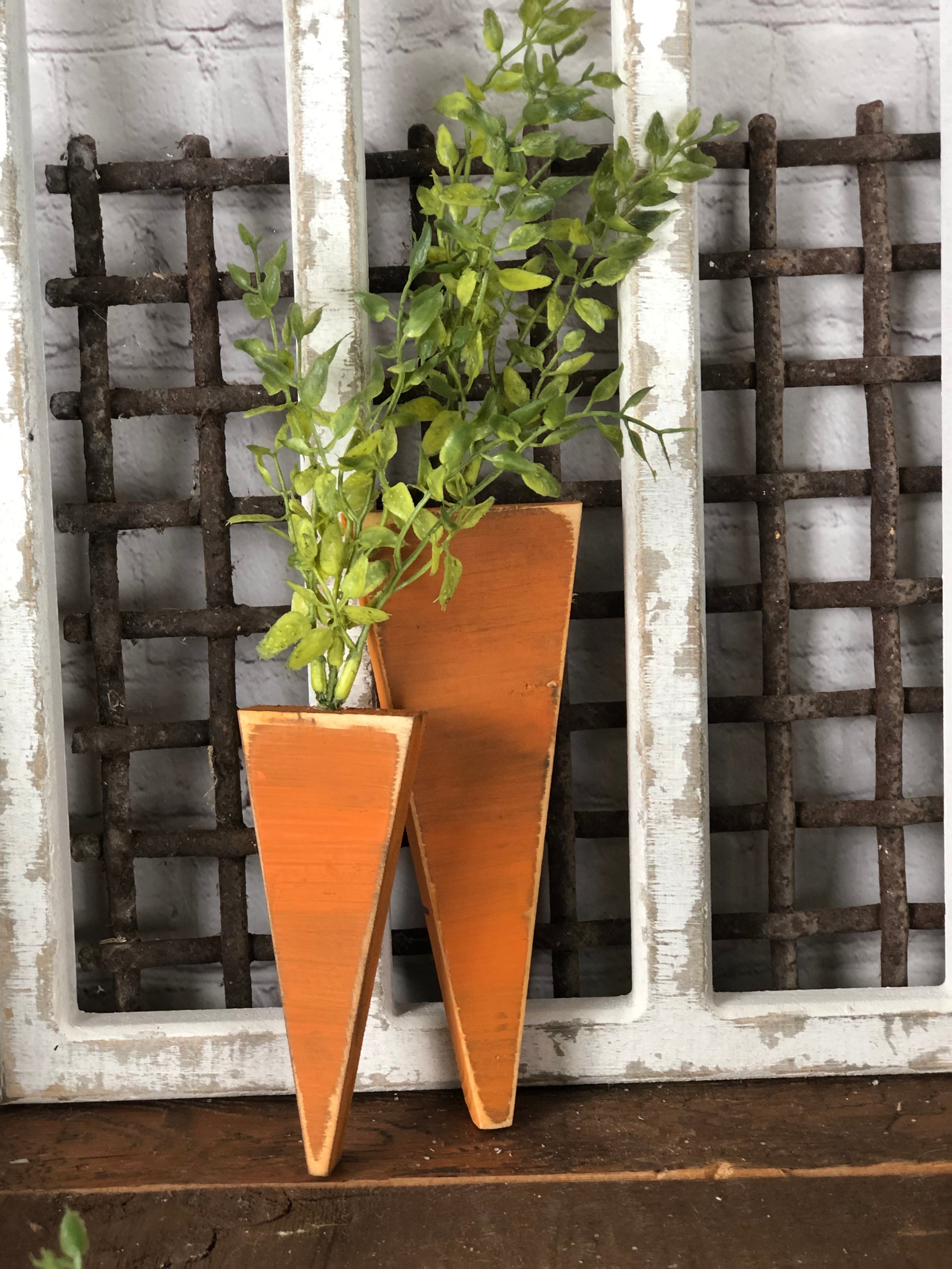 Add a set of these wood carrot to your decor. Pair it with a bunny sign (sold separately) or to a garden sign (sold separately). Perfect for Easter and spring. The back side of the carrot may have imperfections as old lumber was repurposed.
